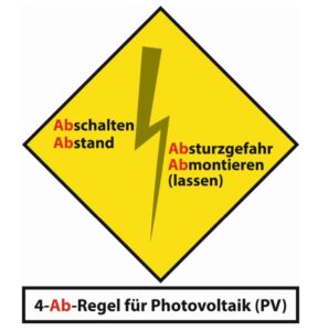 Der Österreichische Bundesfeuerwehrverband (ÖBFV) hat im August 2024 ein Infoblatt „Photovoltaikanlagen und deren Speicheranlagen – Einsatzmaßnahmen und Erläuterungen“ veröffentlicht. In dieser sehr umfassenden Unterlage, an deren Ausarbeitung ich mitwirken durfte, ist im Anhang eine solche Merkregel enthalten.